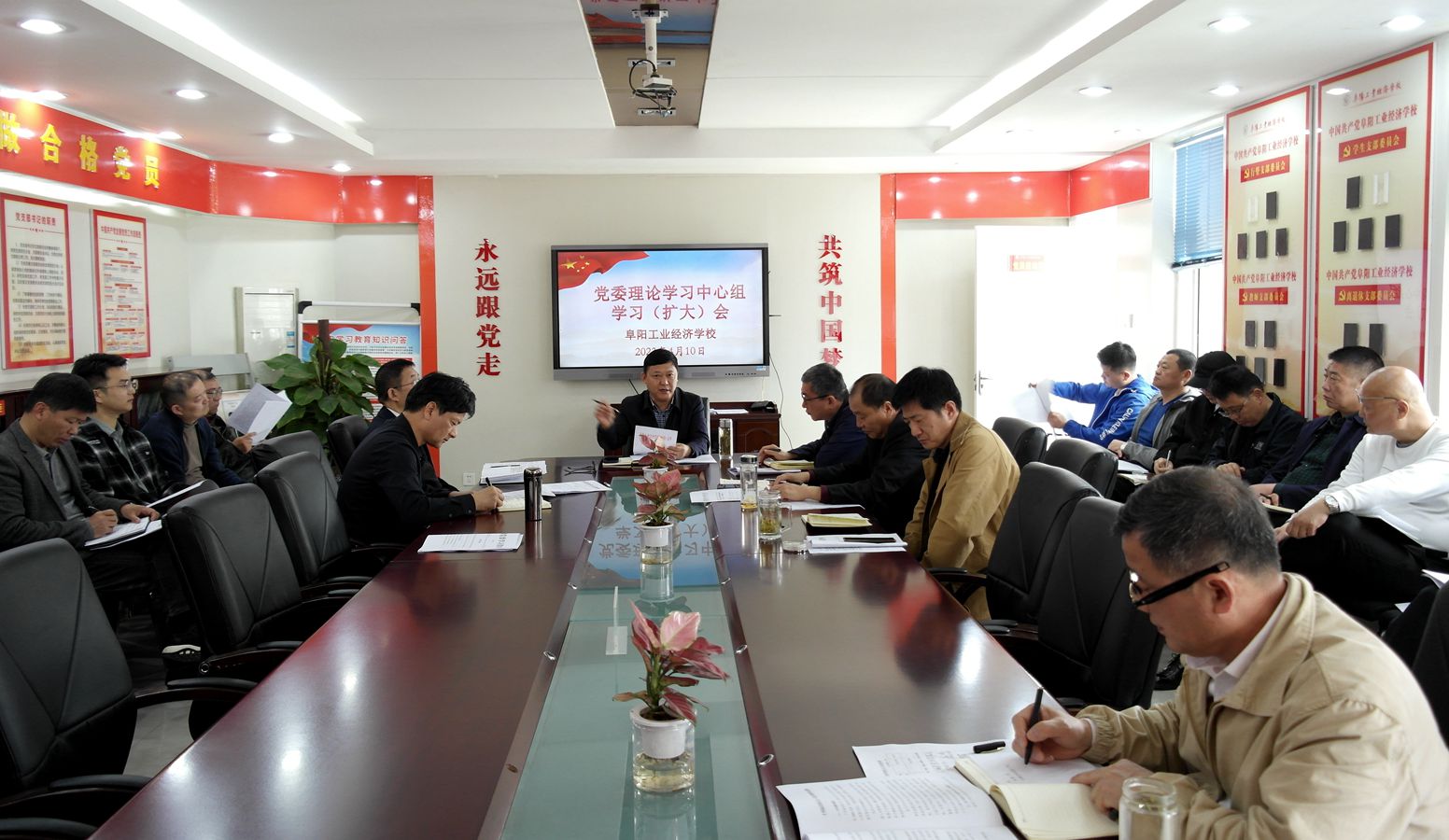 4月10日,我校召开党委理论学习中心组学习扩大会。校班子成员、中层以上干部(含教研组组长)参加会议。会议由校党委书记、校长周波主持。