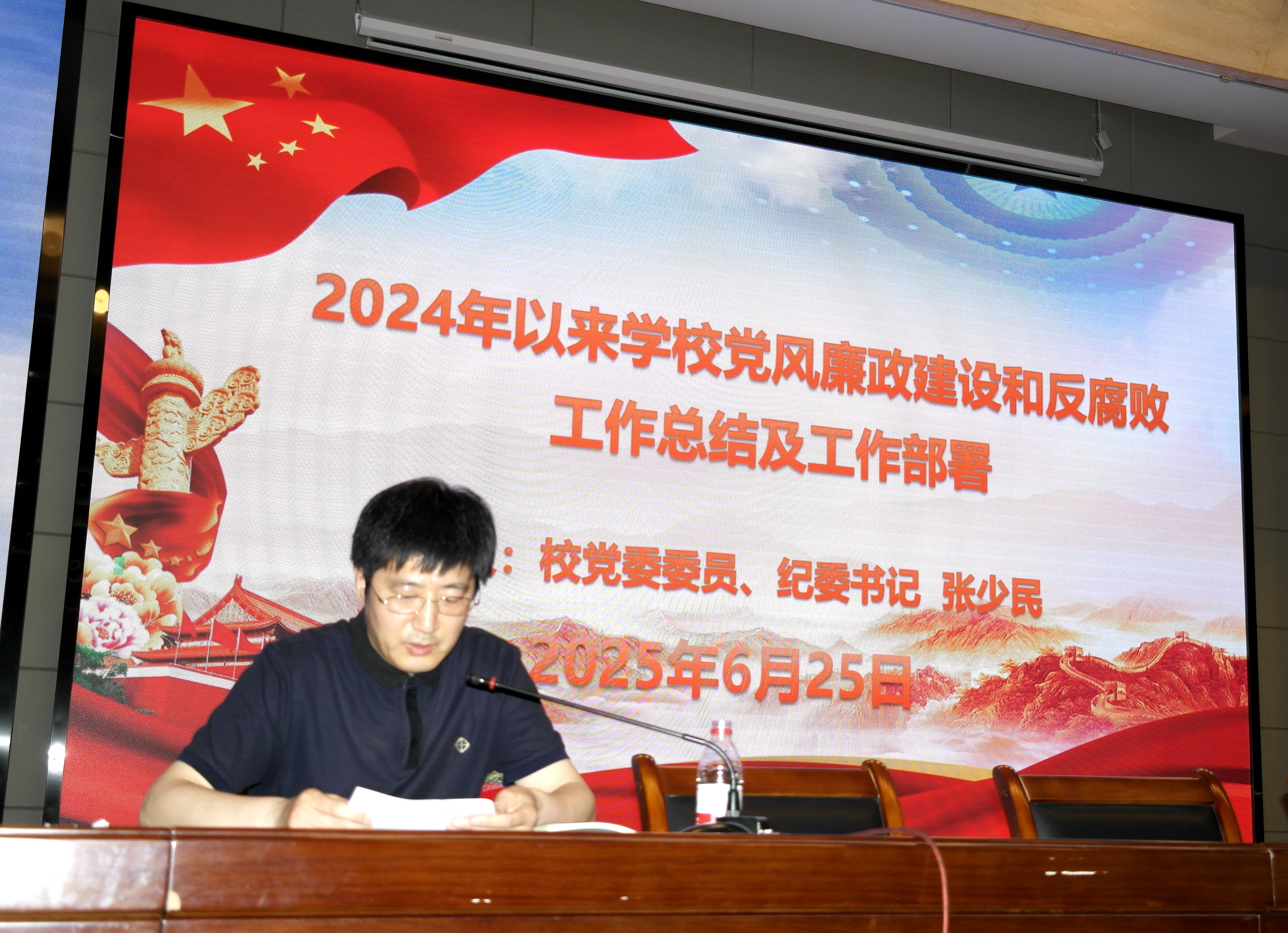 党委委员、校纪委书记张少民作纪委工作报告,全面梳理2024年以来学校党风廉政建设与反腐败工作成果。同时明确下一步工作方向,要求强化政治监督,确保党中央决策部署在校园落地见效;紧盯“四风”问题,持续完善制度体系,扎紧制度笼子,推动各项工作提质增效。