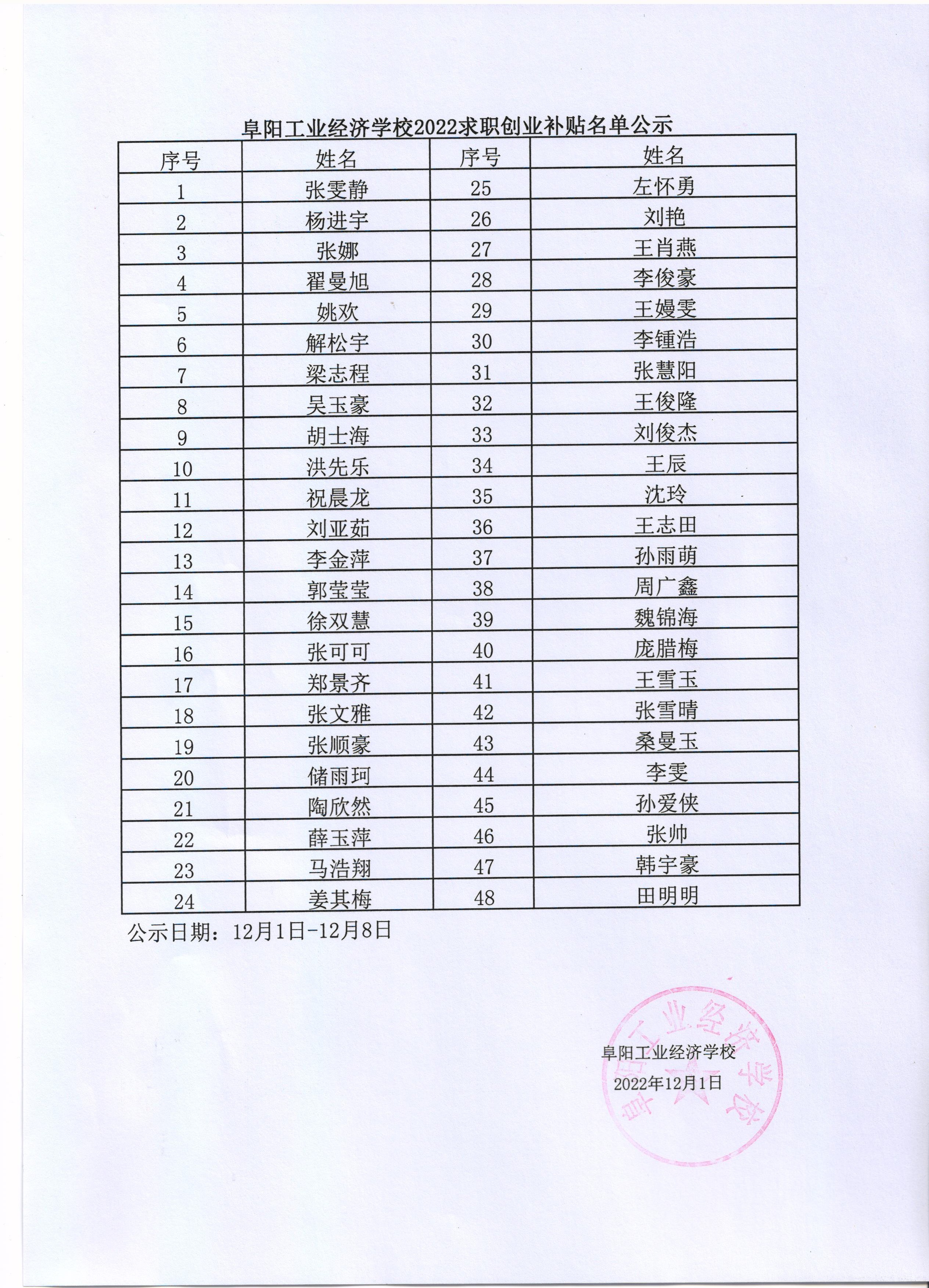 阜阳工业经济学校2022年创业补贴名单公示