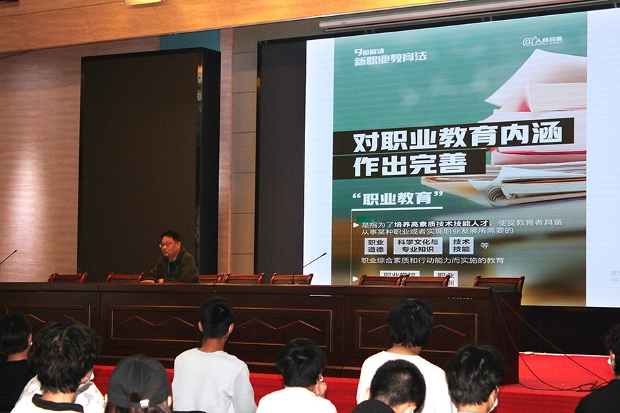 日在学校大礼堂教务科李阜生科长给在校部分学生代表解读新修订的《职业教育法》。