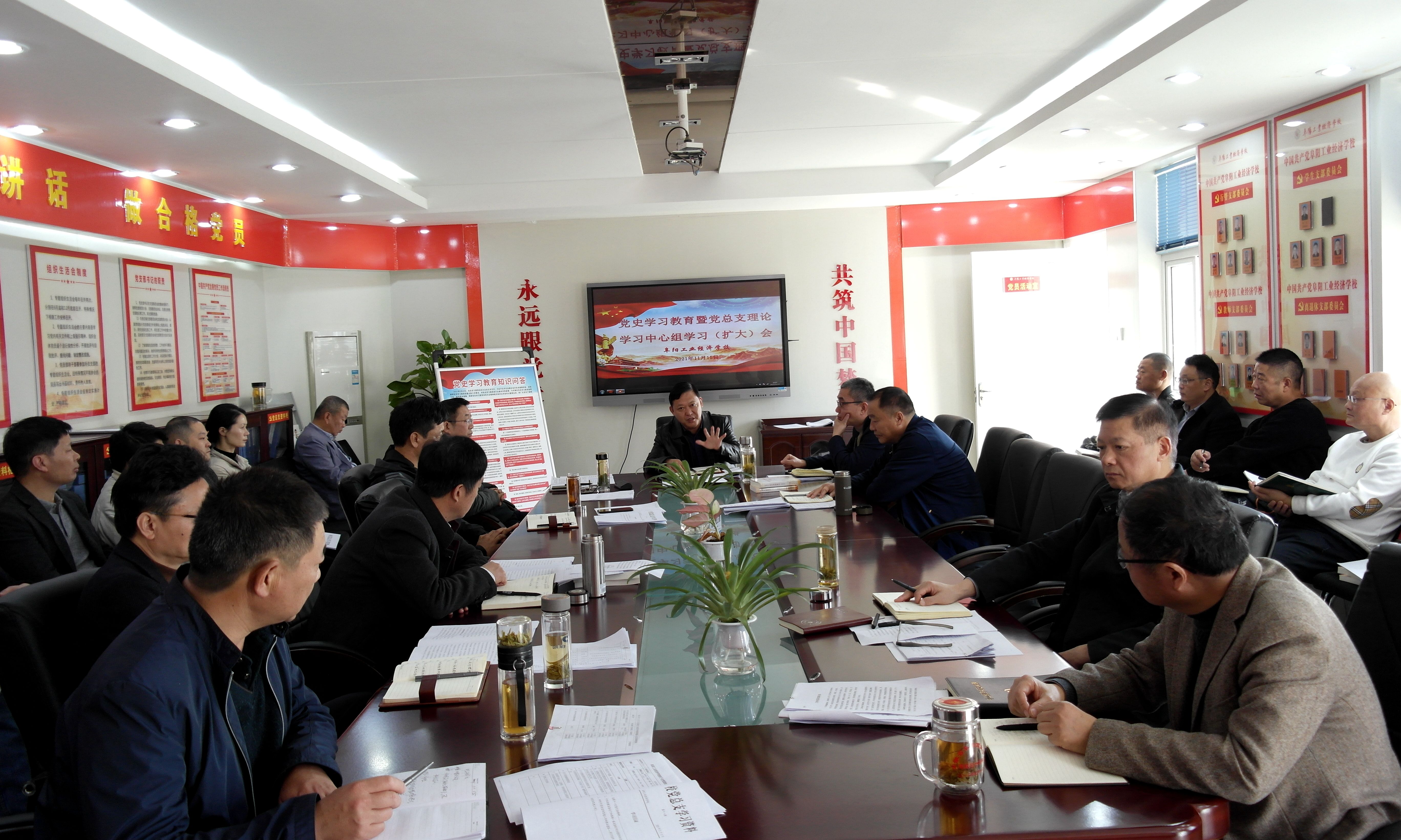 11月15日,阜阳工业经济学校召开党史学习教育专题学习会暨党总支理论学习中心组学习(扩大)会。校班子成员、各科室负责人参加会议。会议由校党委书记、校长周波主持。