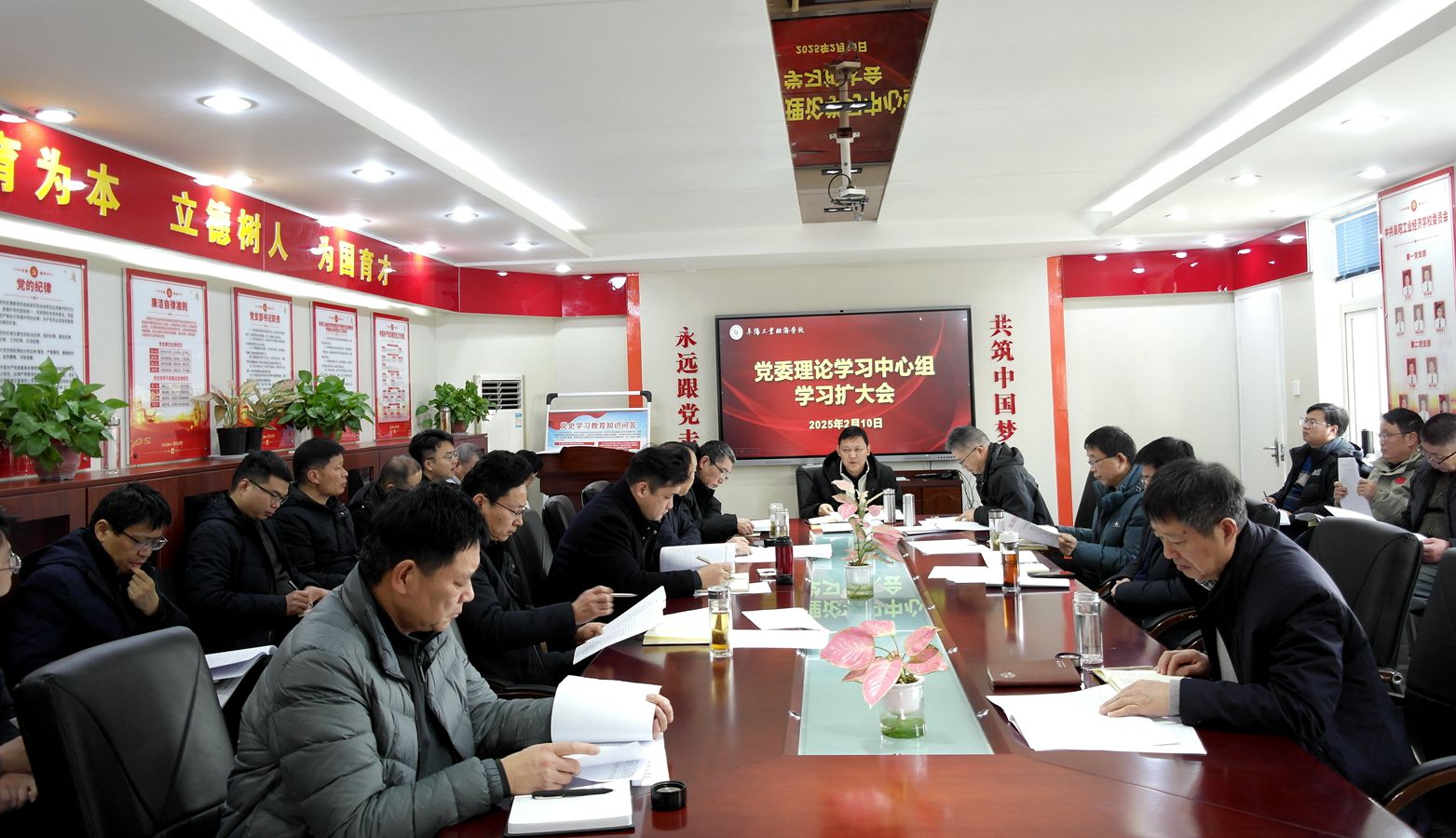 2月10日,阜阳工业经济学校召开党委理论学习中心组学习扩大会,校党委书记周波主持会议并讲话,校班子成员、各科处室负责人参加会议。